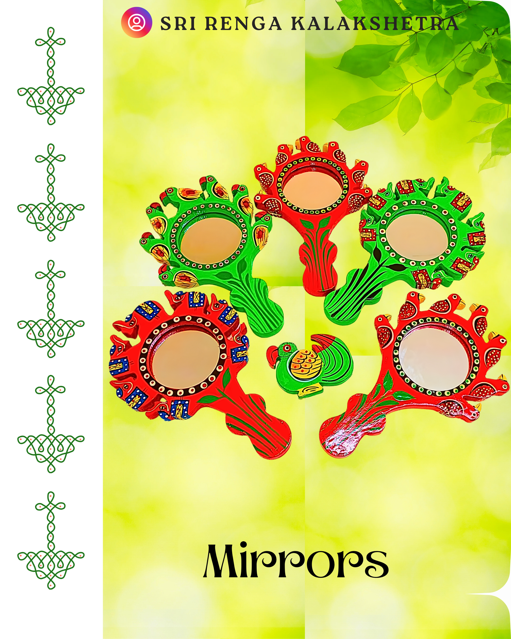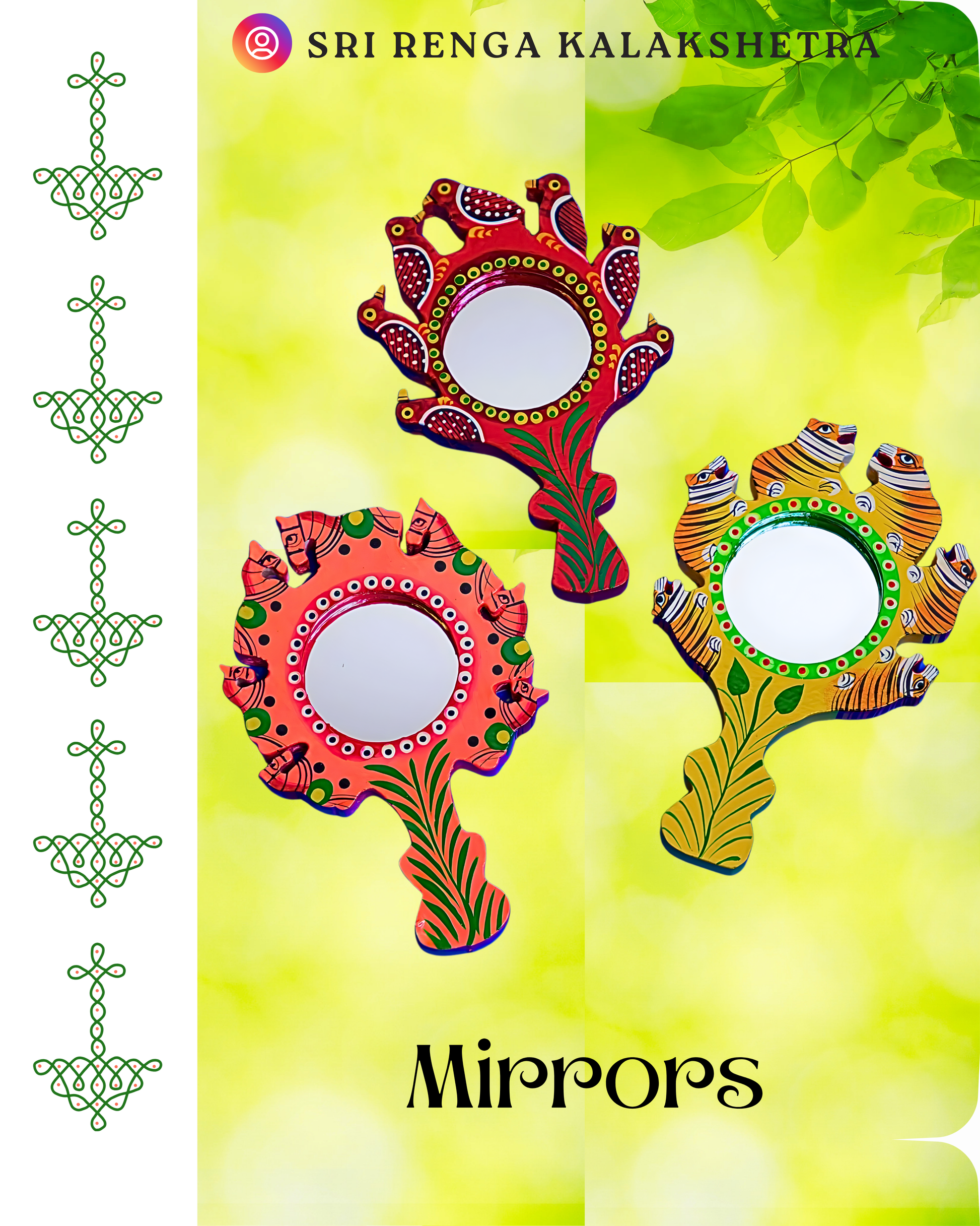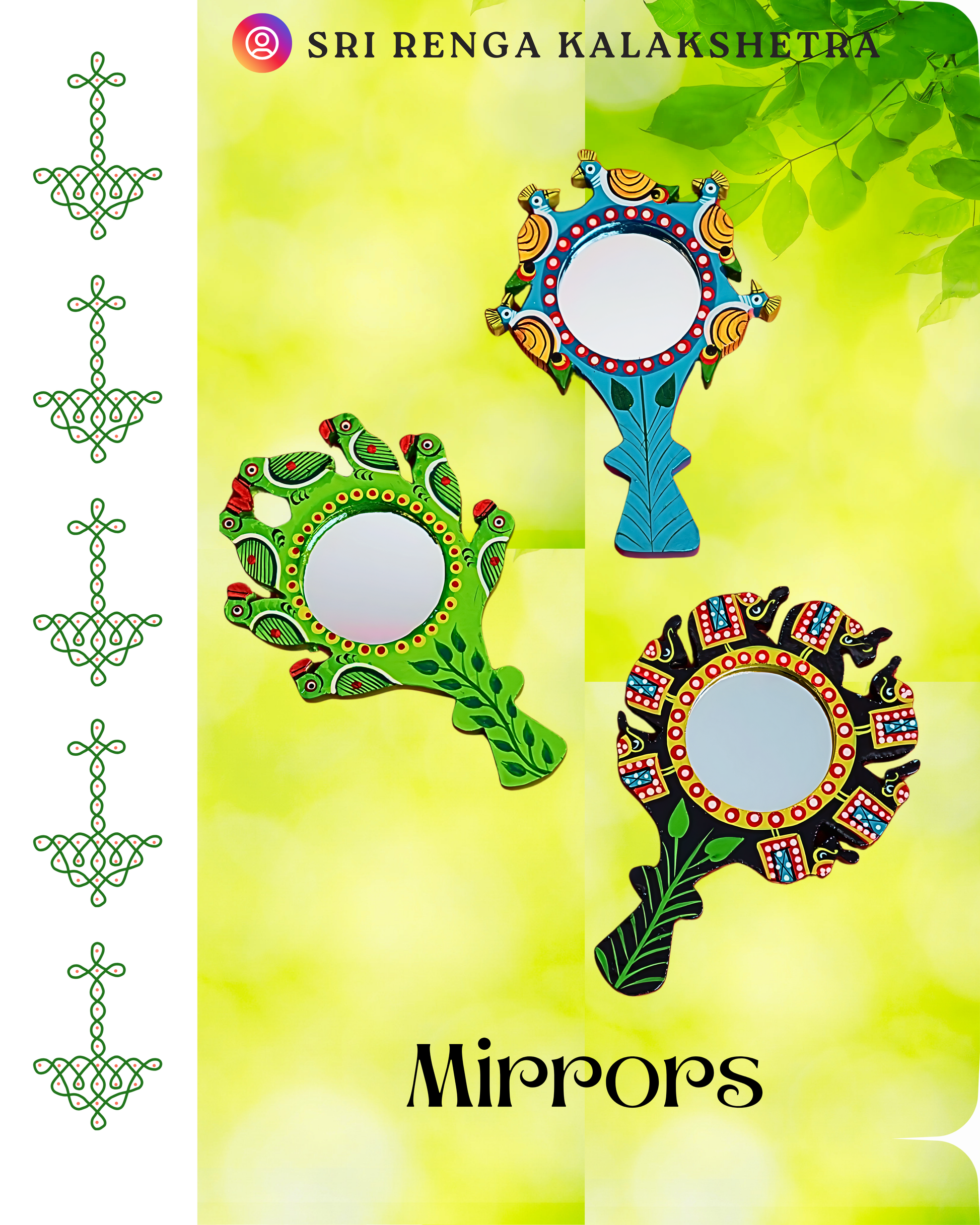 Adorned with vibrant colours and traditional Indian motifs, it is both functional and decorative, perfect for daily use or for display on a vanity. Whether given as a thoughtful gift or treasured as a cultural keepsake, this hand mirror reflects the skill, story of a craft passed down through generations.