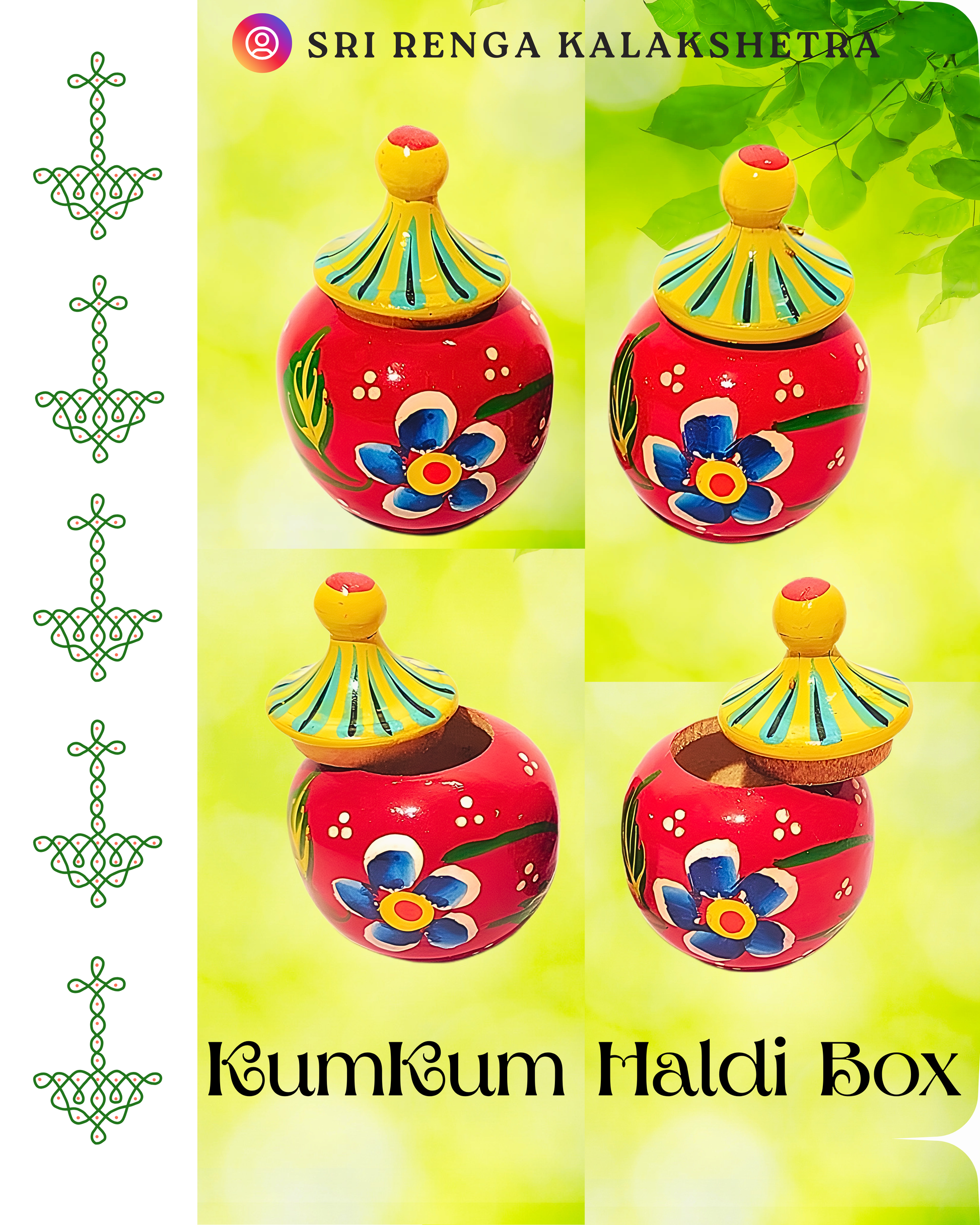 Made from natural colours, it is safe, eco-friendly, and perfect for gifting or daily use. Ideal for weddings, Navaratri, or as a decorative addition to any sacred space, this kumkum haldi box combines beauty, tradition, and functionality in one compact design.