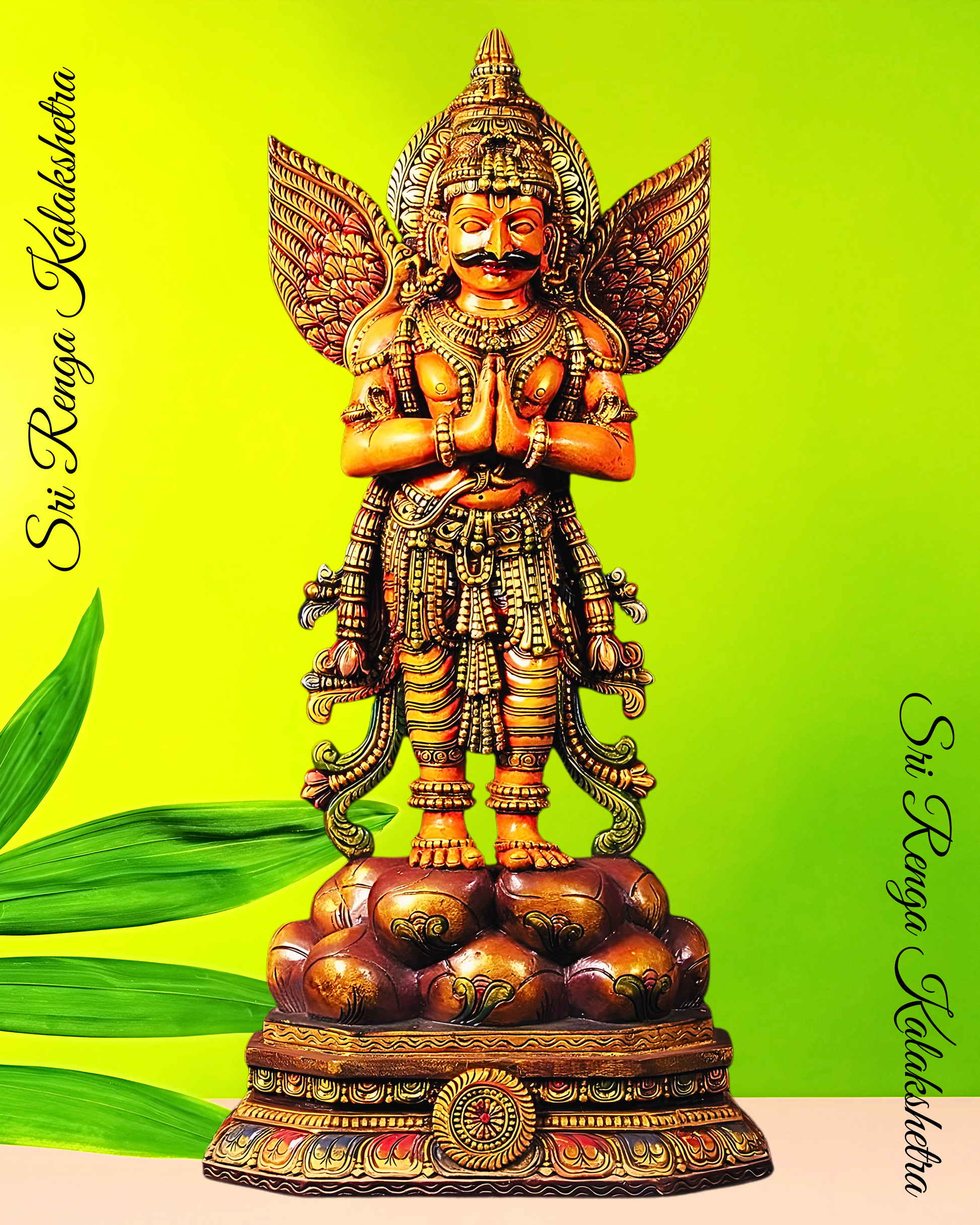 Garuda, the King of Birds and the sacred vehicle of Lord Vishnu, symbolises strength, protection, speed, and unwavering devotion. Garuda is depicted standing in a dignified posture with his hands in the Anjali Mudra, offering reverence to his Lord. His wings are spread wide, giving a commanding presence, his strong facial features, and his thick moustache, add to his majestic character.