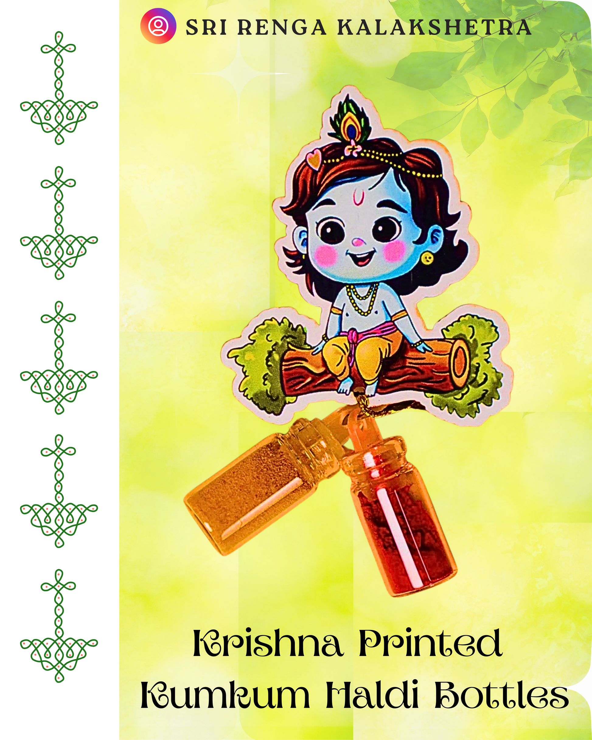 โข 1 Baby Krishna-themed fridge magnet with attached haldi and kumkum vials