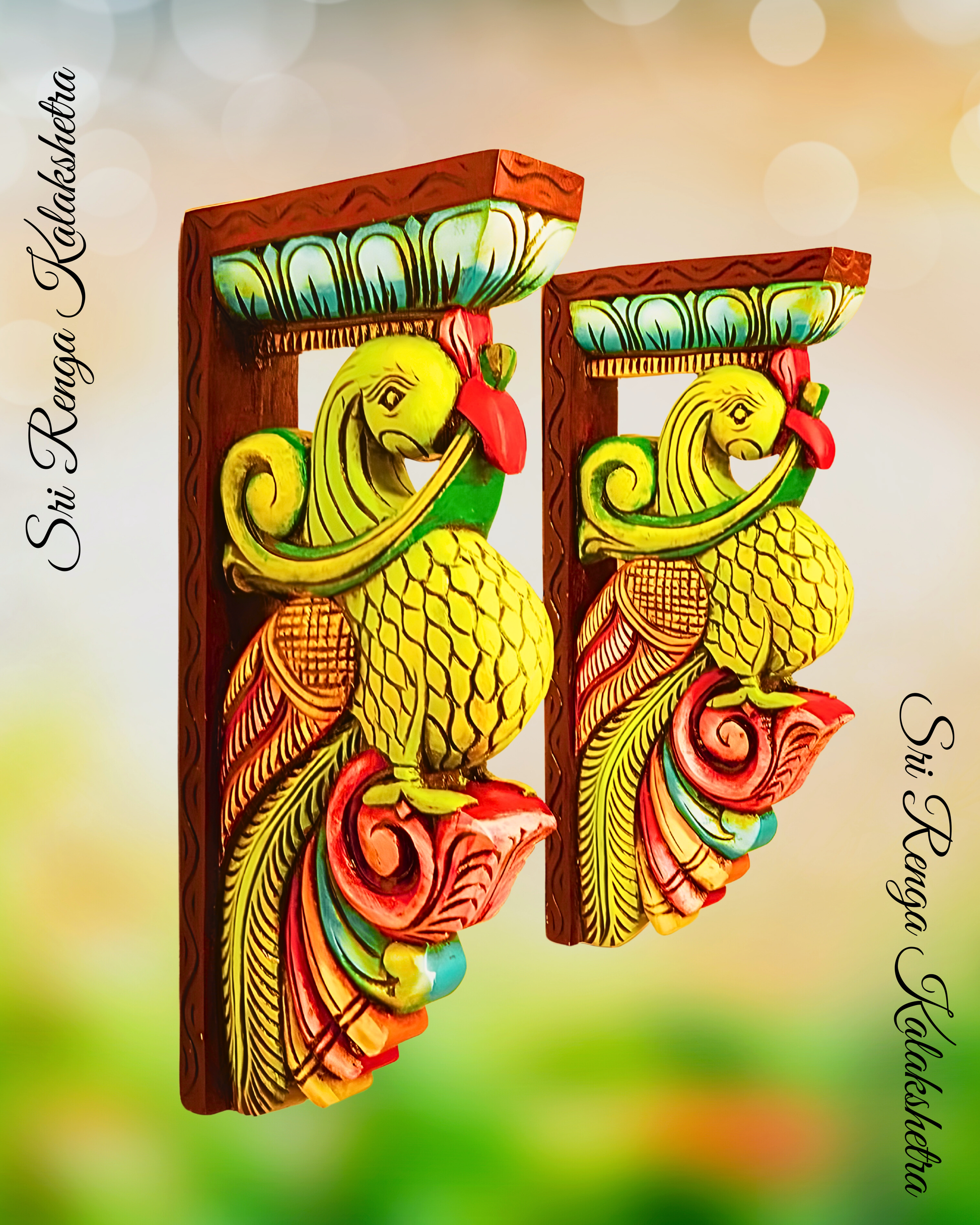 This decorative wall bracket features a beautifully carved parrot, a bird traditionally associated with happiness, well-being, and harmony. Crafted by skilled artisans using premium quality wood, the bracket is finished with detailed hand painting in rich, multicolour tones. Its sturdy form allows bells or lamps to be suspended, making it suitable for pooja rooms as well as decorative corners. Available as single piece.Β