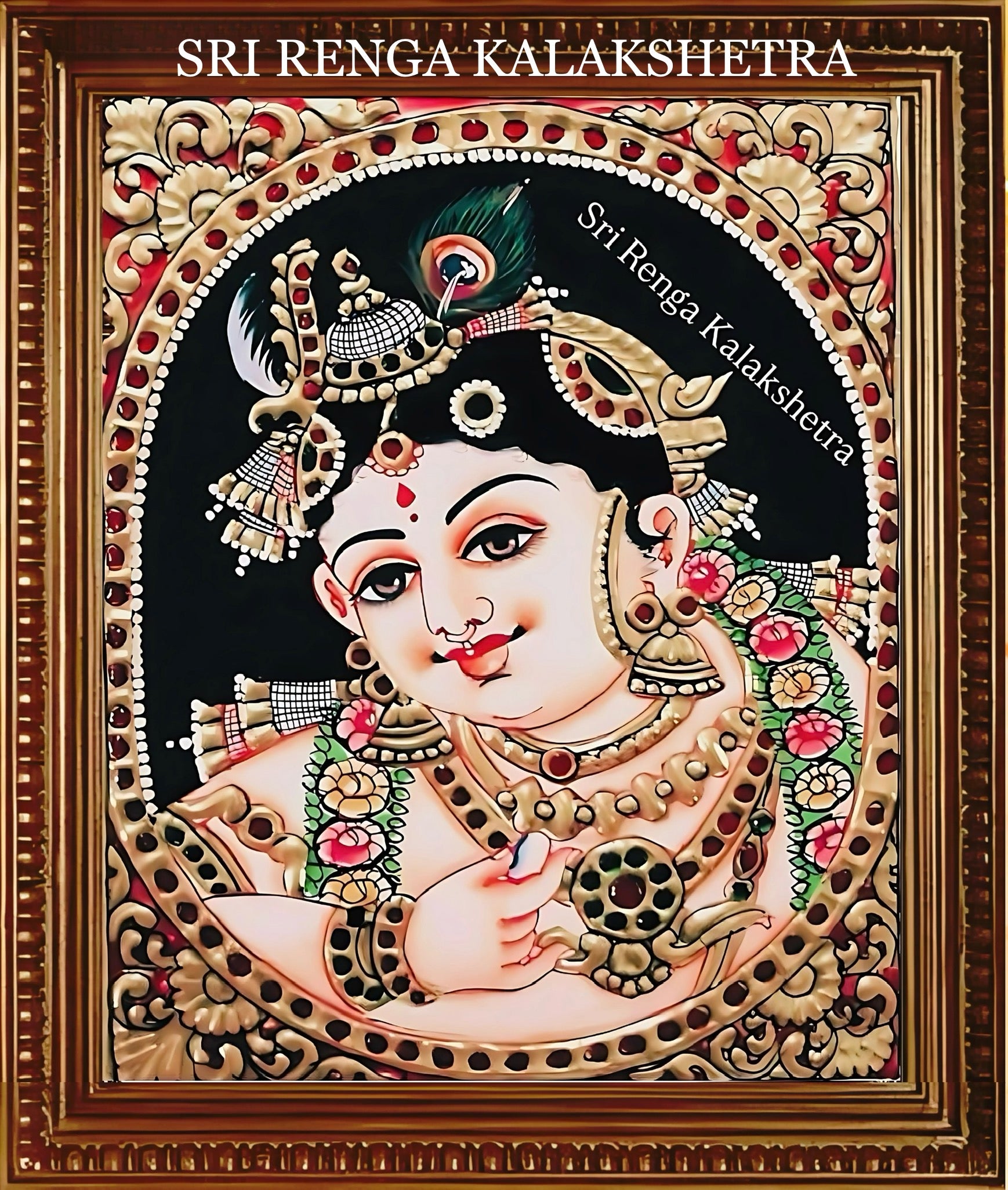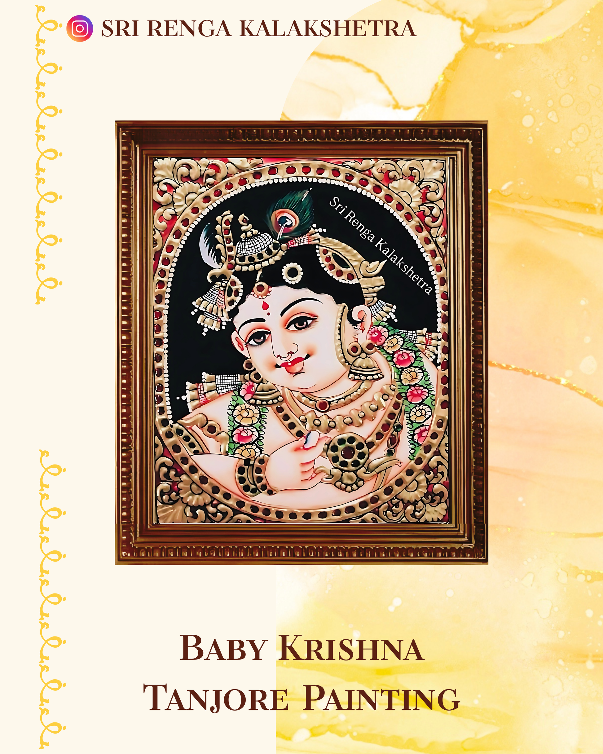 Adorn your space with the enchanting face of Baby Krishna with a tender smile, bright eyes, and his beloved butter in hand, depicted in traditional Tanjore art style. Radiating innocence, joy, and divine charm, this artwork brings the playful spirit of Krishna into your home.