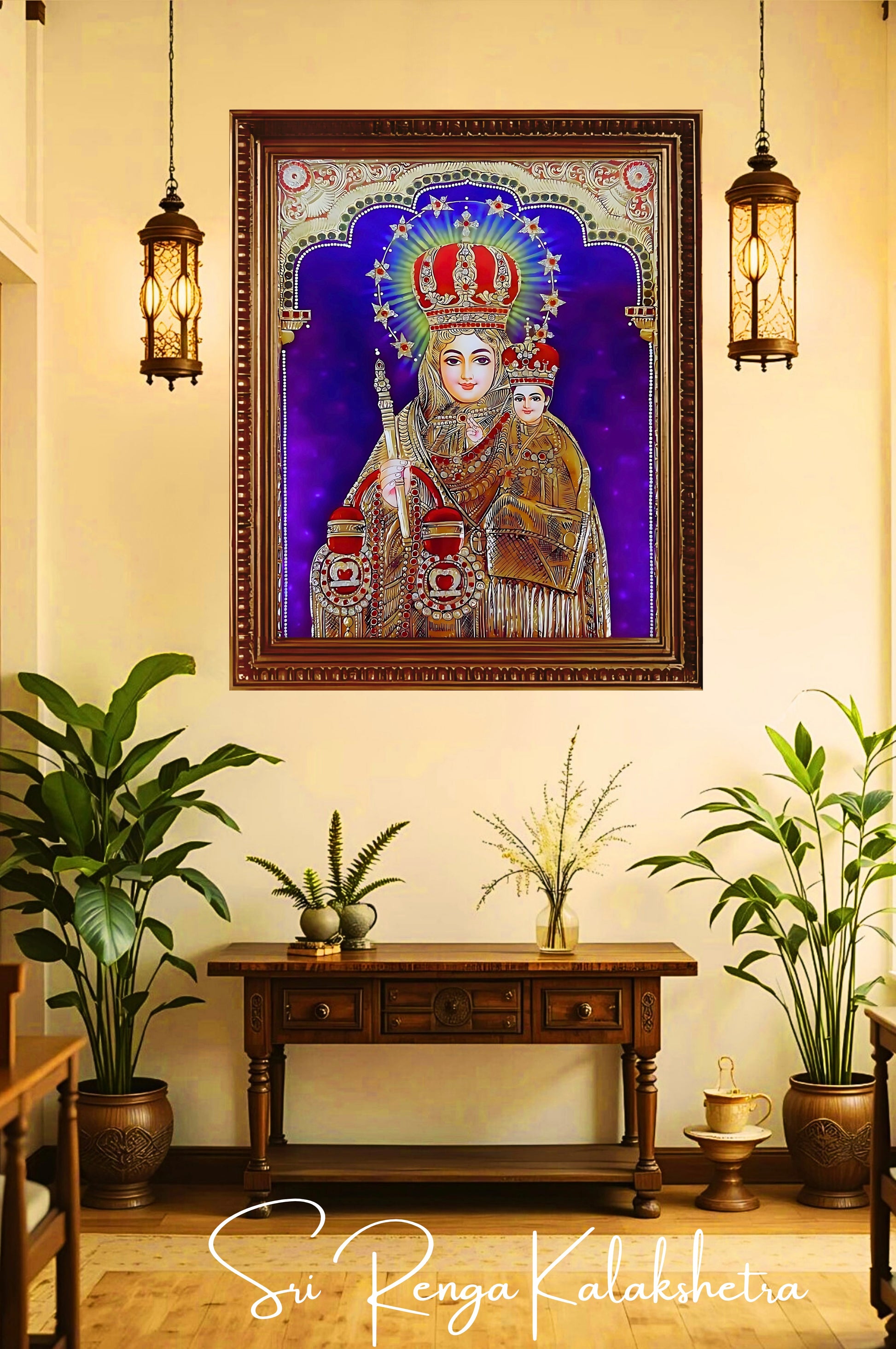 This exquisite Tanjore painting captures Our Lady of Velankanni with the Infant Jesus in her arms โ a radiant embodiment of divine love, protection, and motherly care.