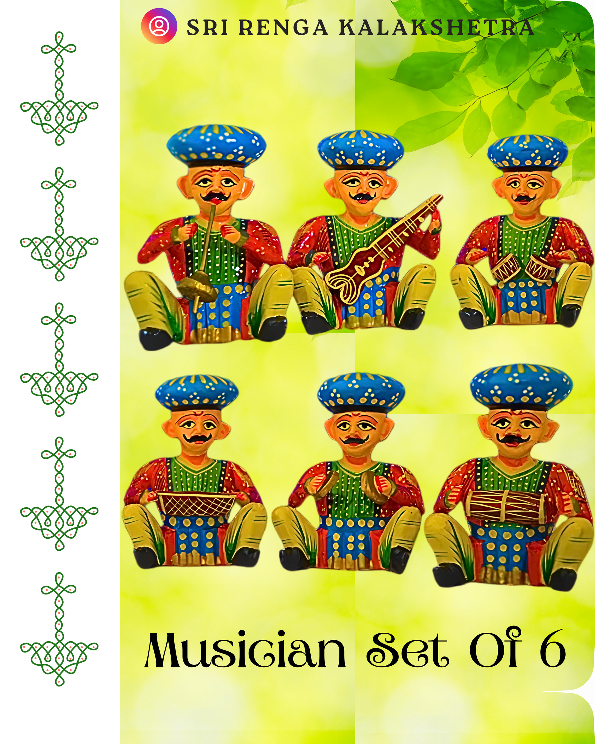 โ€ข 6 hand-painted wooden Rajasthani musician figurines (assorted instruments: dholak, sitar, tabla, manjira, sarangi, shehnai)
