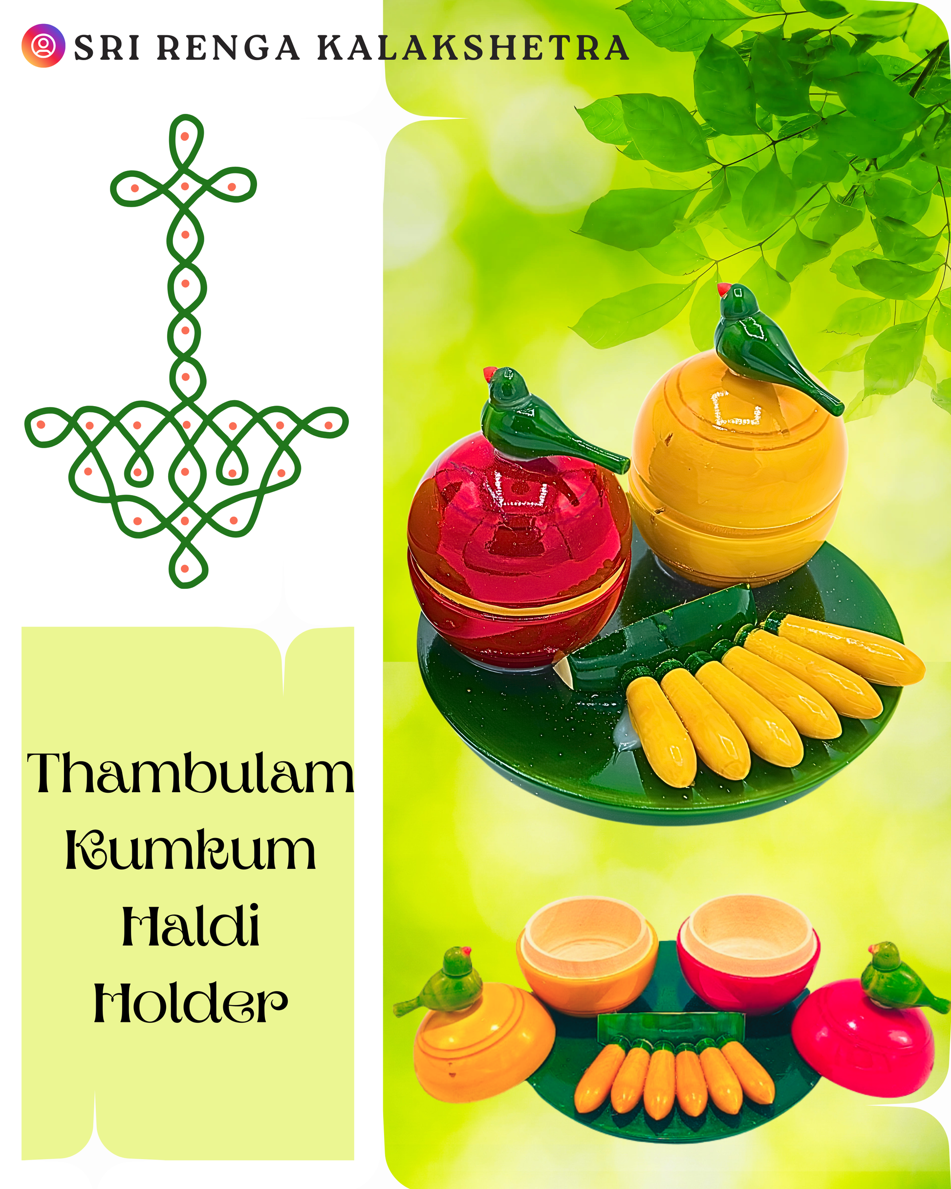Celebrate tradition and festivity with this handcrafted wooden kumkum haldi box, featuring a vibrant thamboolam model, adorable sparrows. Made from natural colours, it is eco-friendly, adding a touch of cultural elegance to your pooja or festive setup. Perfect for Navaratri, wedding gifts, this vibrant kumkum haldi box combines artistry and tradition in a compact, eye-catching design.