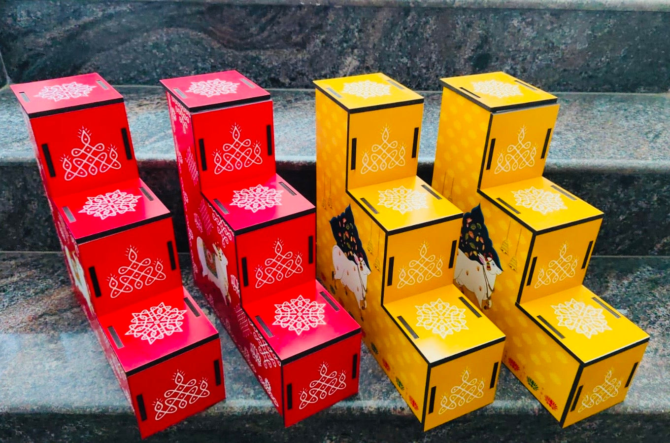 Each step measures 4" ร 4" ร 4", forming a compact display with a total size of 12" ร 12" ร 4". Crafted with a sturdy 4 mm thickness, this diya stand offers durability along with an easy set up, making it convenient for regular and festive use.