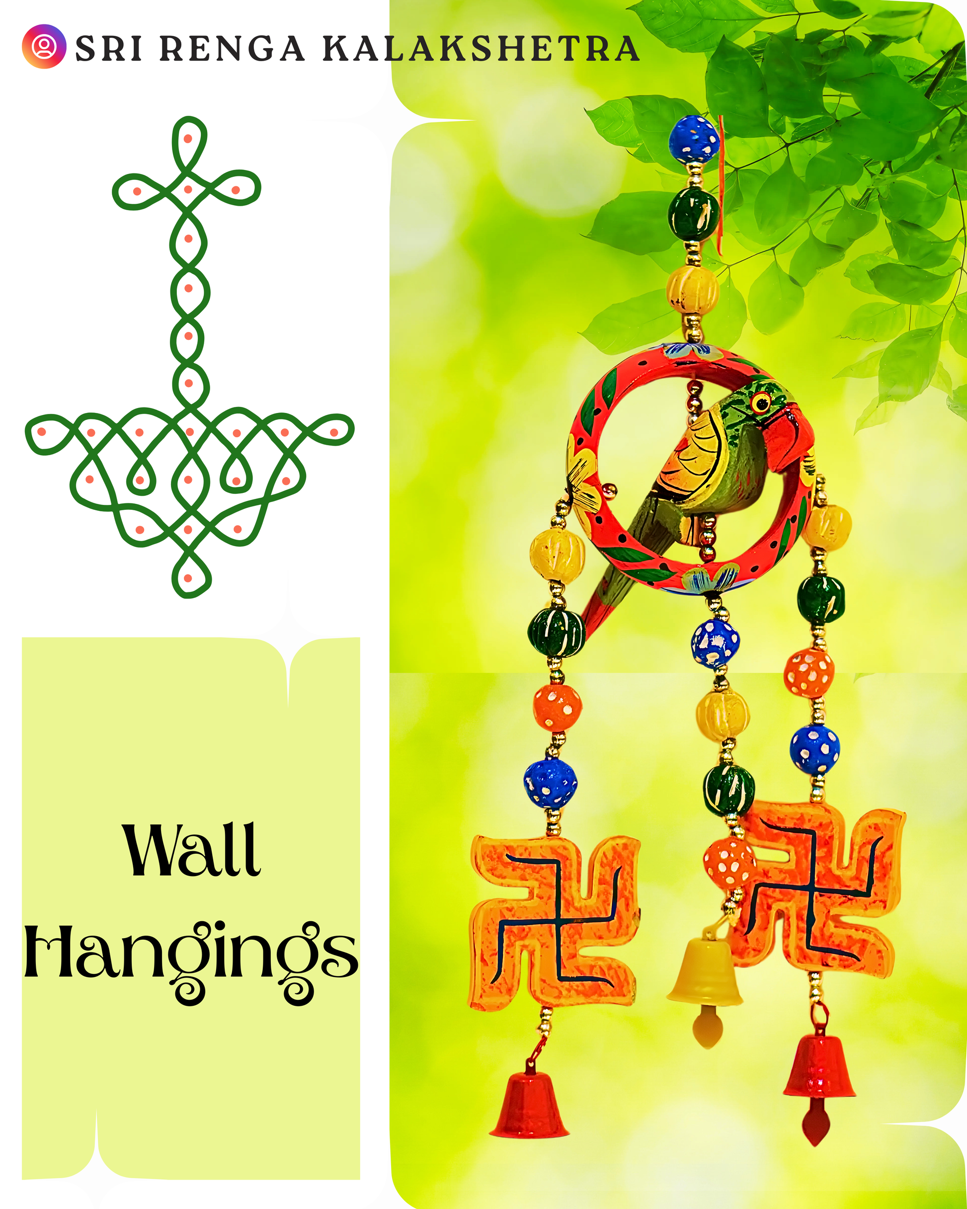 Colour, tradition, and artistry โ beautifully brought together. Featuring a decorative ring with a parrot sitting gracefully at the centre, followed by a string of vibrant beads and finished with two hand-painted Swastik and bells, this piece adds a festive, divine and artistic charm to any space. Can be displayed as a ceiling or wall hanging.