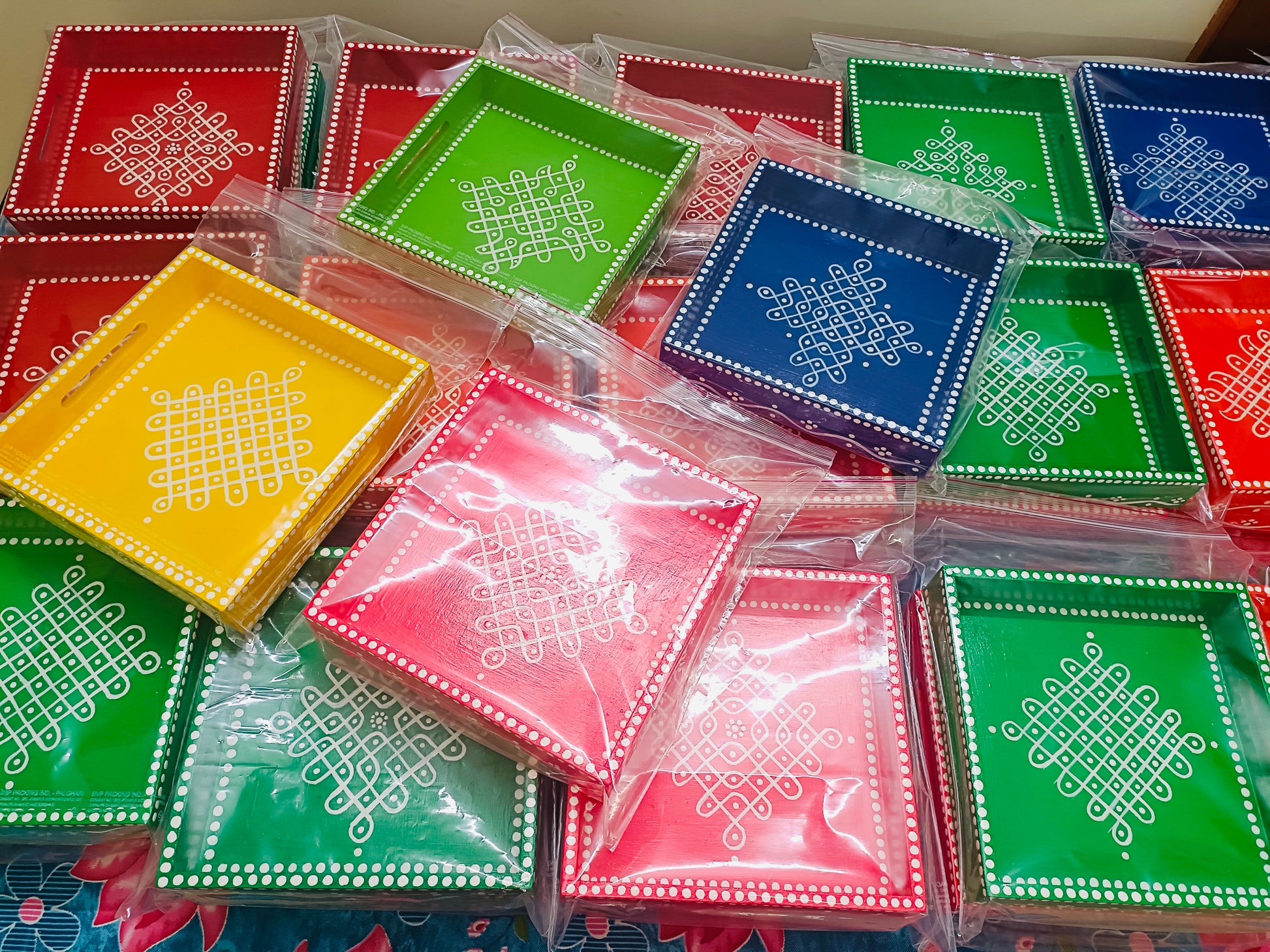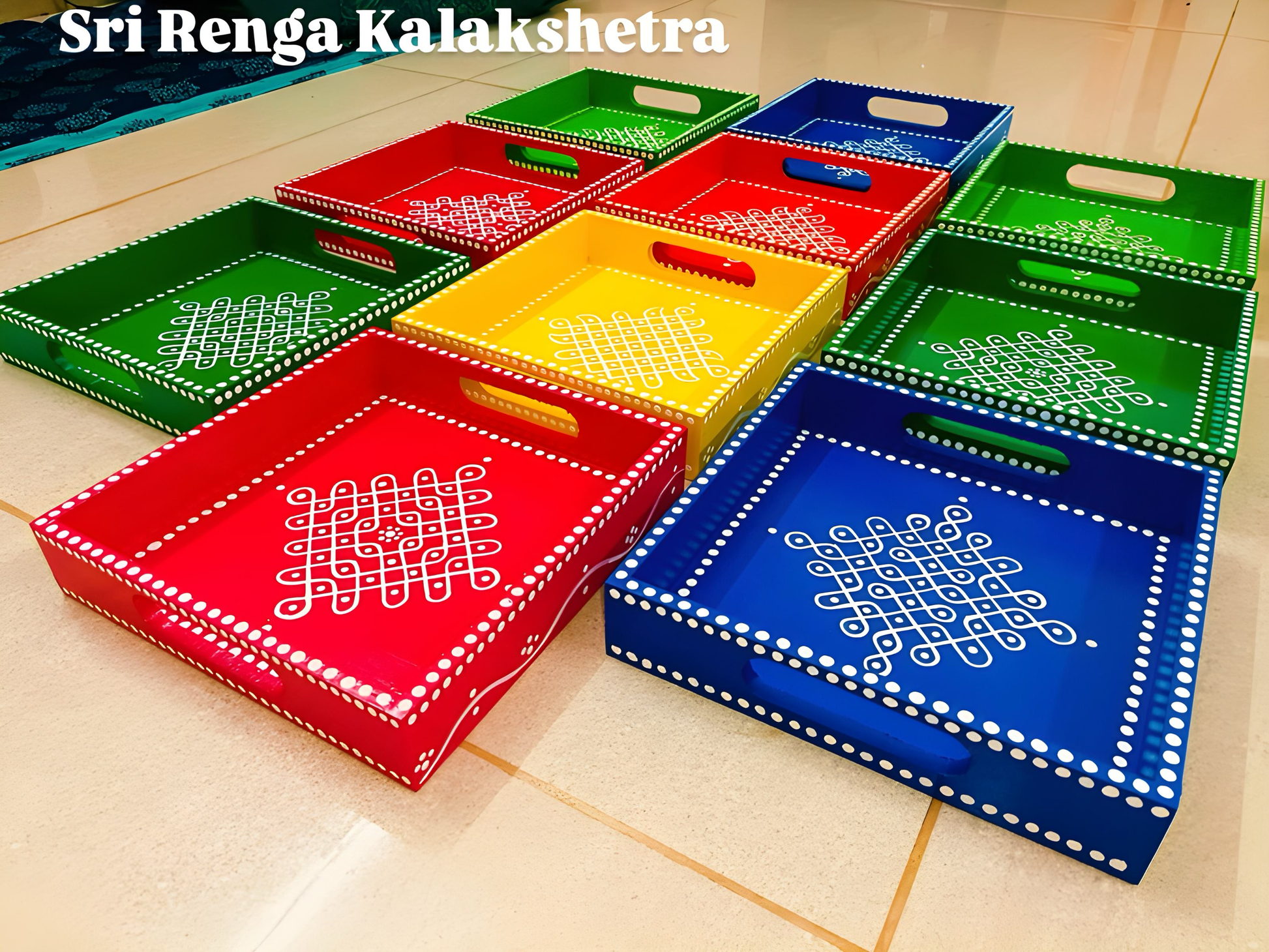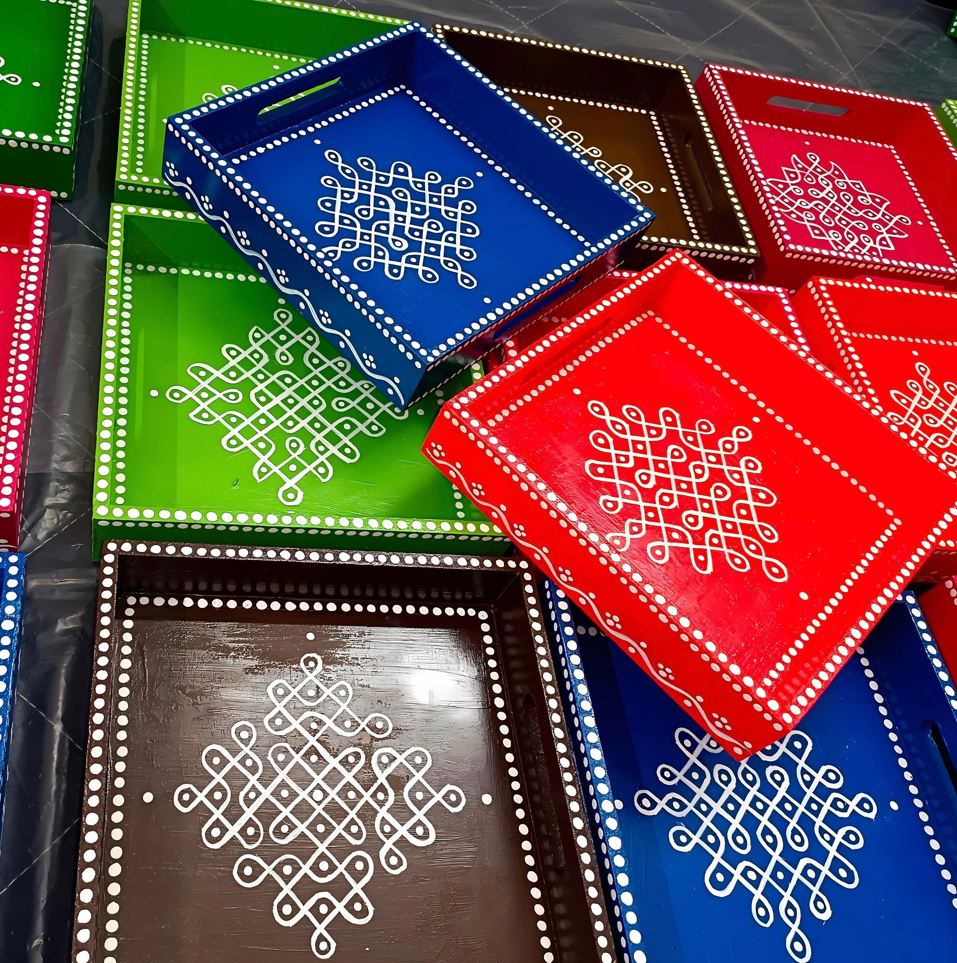 โข 1 hand-painted Kolam Art wooden tray with handles