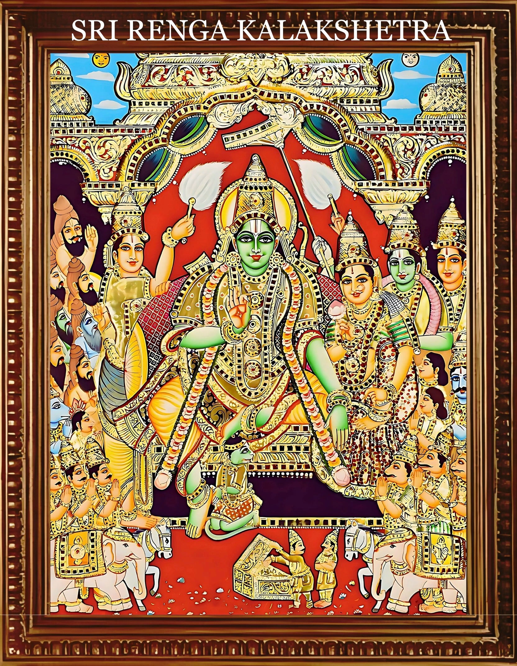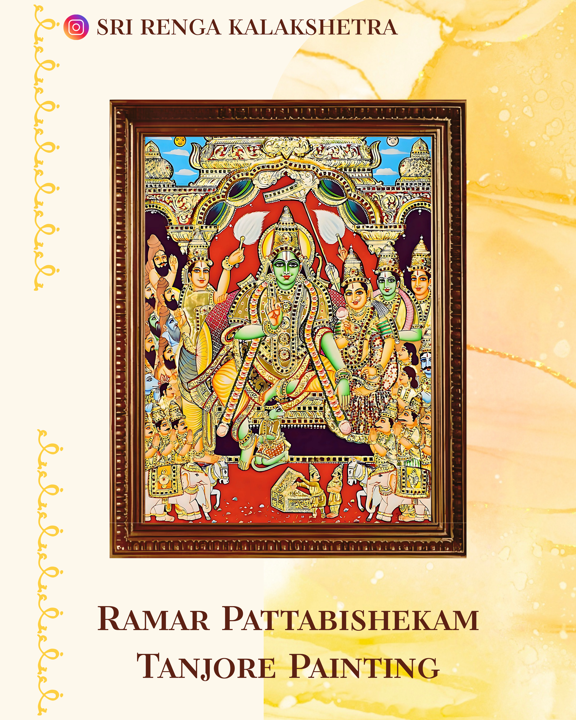 This sacred artwork has been lovingly created to celebrate the divine coronation of Lord Rama, a moment of dharmaโs triumph and cosmic harmony. Symbolising righteousness, and divine kingship, the Pattabhishekam of Sri Rama is a sacred scene revered by devotees across generations.
